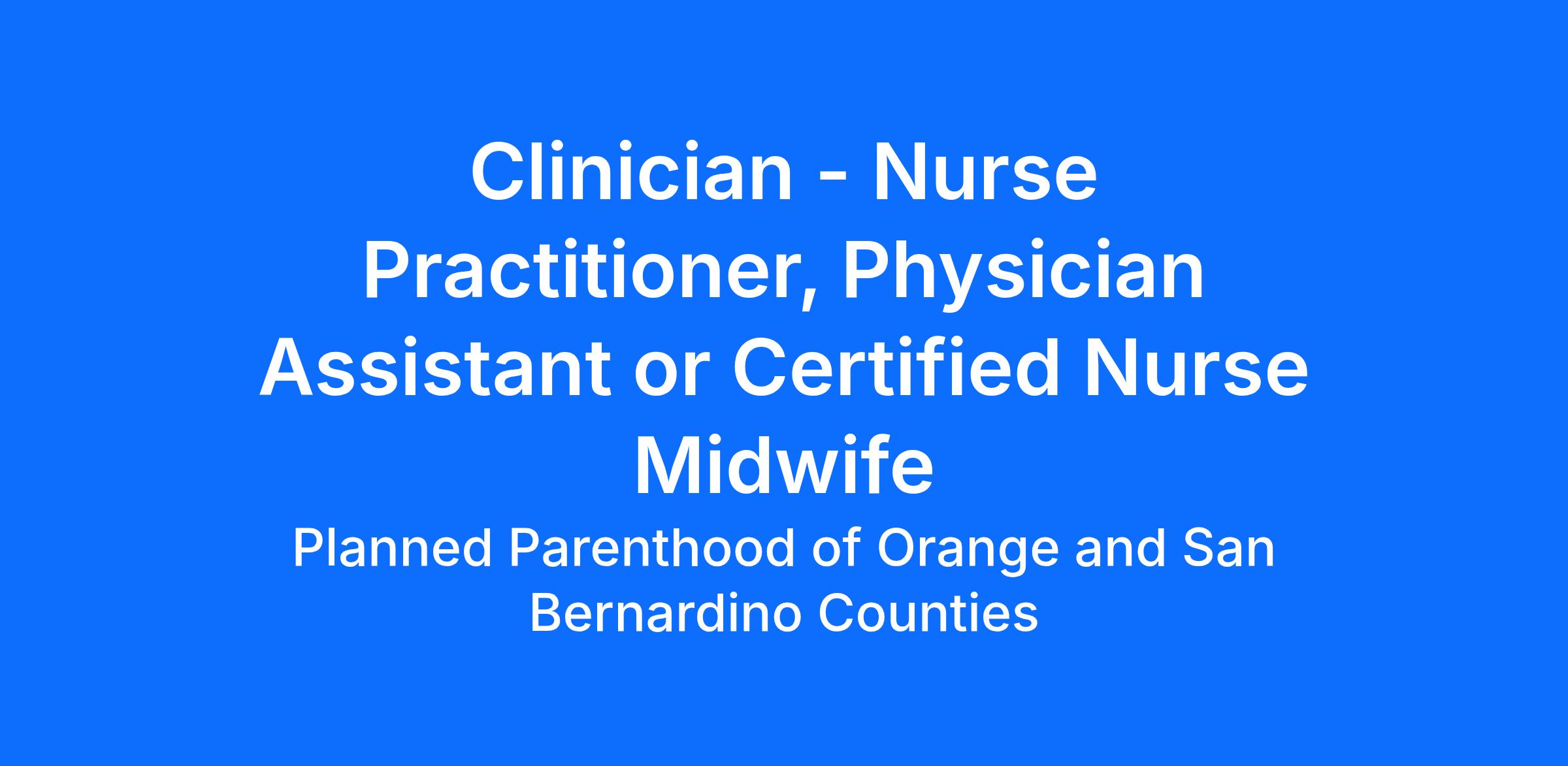 PPOSBC is looking for a Clinician to join the Mission Viejo Health Center team, that will provide non-judgmental, empathic and high quality patient care; responsibilities include exams, treatment, education and counseling for patients in accordance with agency protocols.