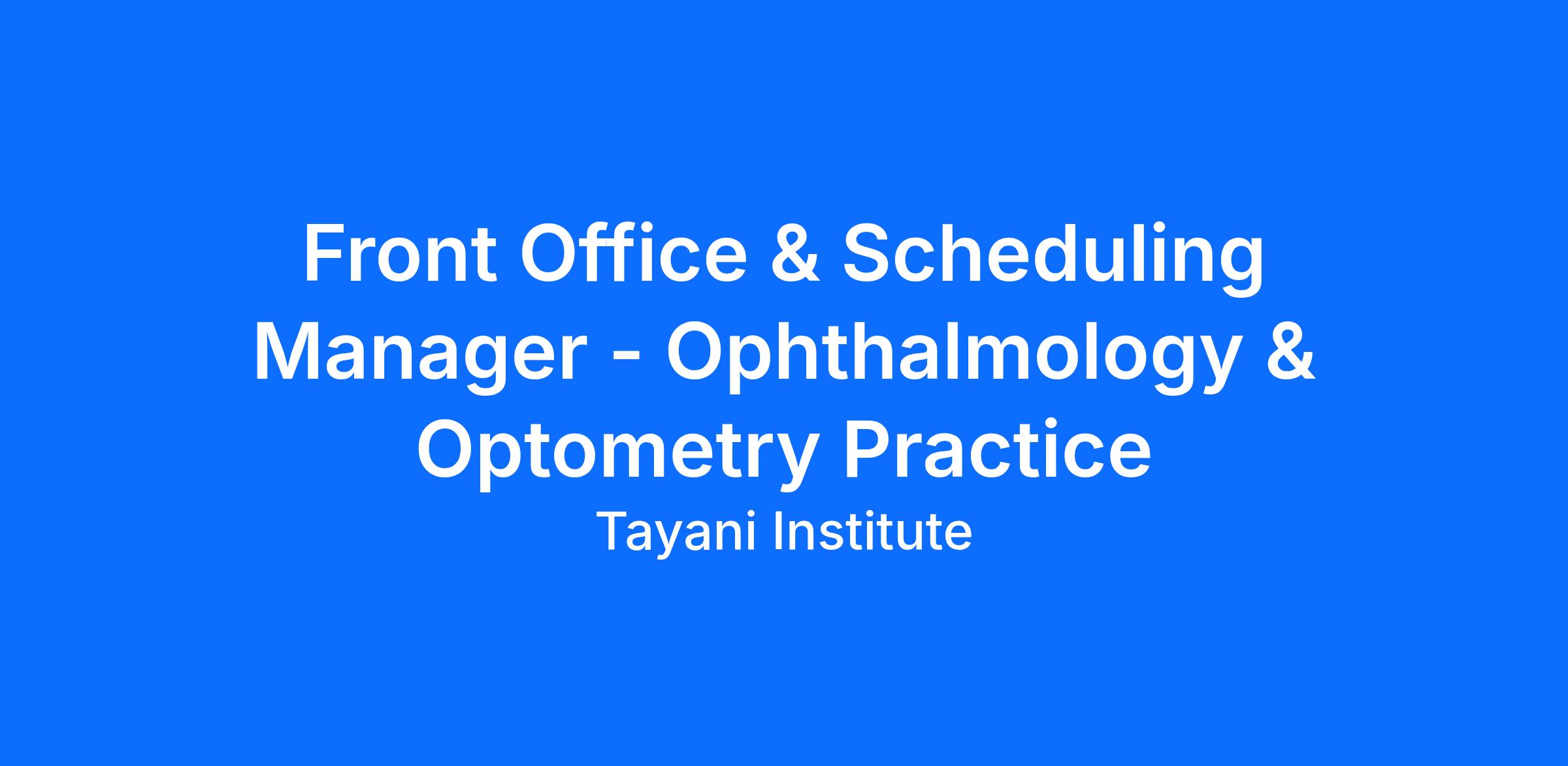 Tayani Institute is seeking a dynamic, experienced, and highly skilled Front Office & Scheduling Manager to lead operations in our high-volume ophthalmology and optometry practice.