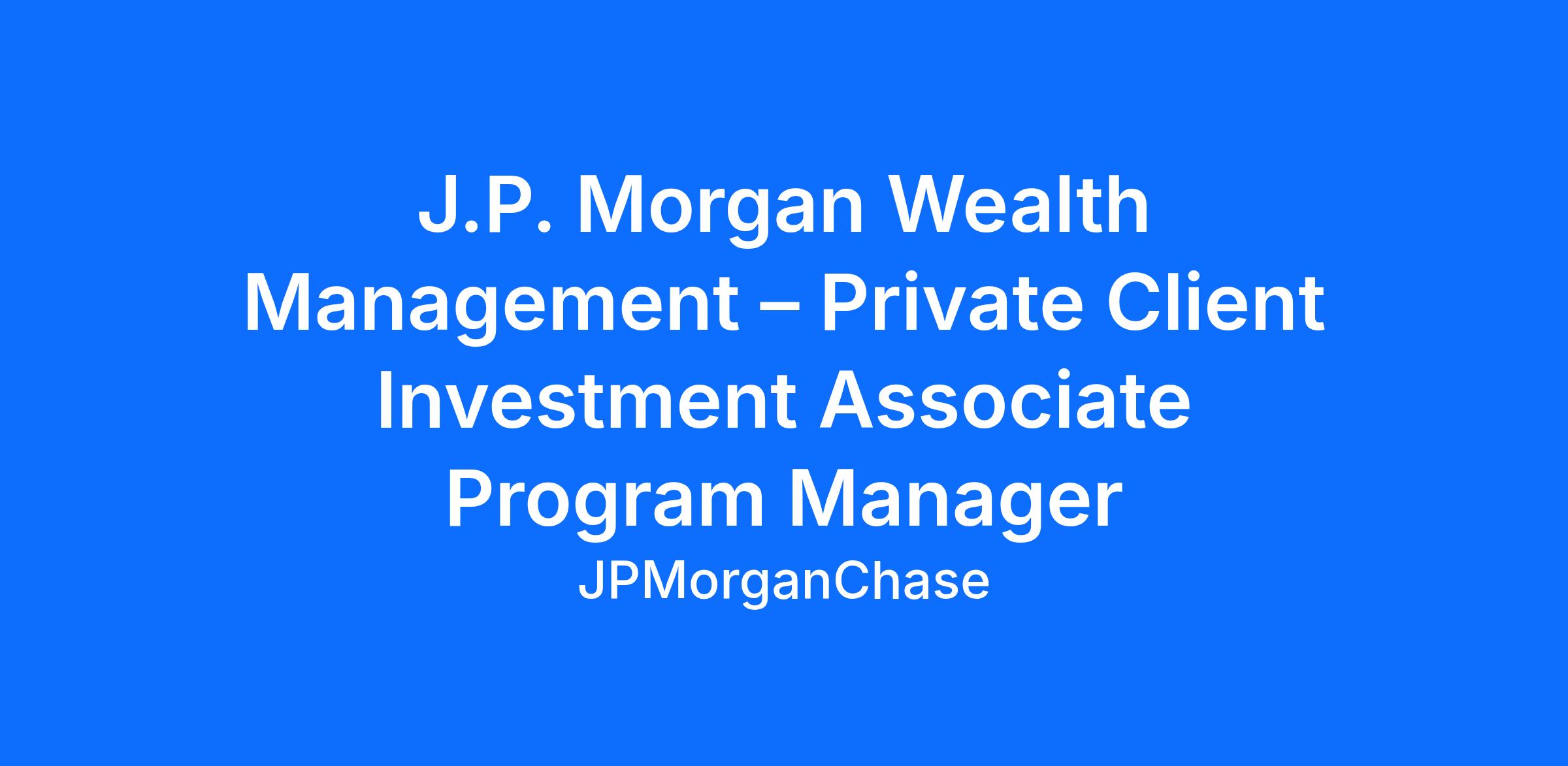 DescriptionThe JPMorgan Wealth Management (JPMWM) business is dedicated to helping investors achieve their long-term financial goals. It encompasses Chase Wealth Management, J.P. Morgan Advisors, J.P. Morgan Self-Directed Investing, J.P. Morgan Investments Direct, and J.P. Morgan Personal Advisors. With ~$400 billion in assets under management and ~4,000 advisors across 3,500 branches and 21 offices, we are seeking a Private Client investment Associate Program Manager to lead our team of Private Client Investment Managers.