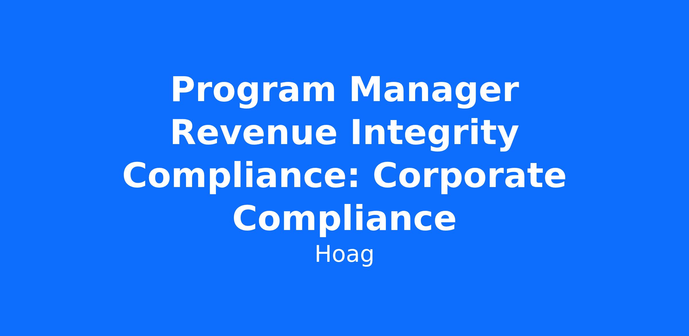 The Program Manager Revenue Integrity Compliance supports implementation of the Revenue Integrity Compliance Program for Hoag Memorial Hospital Presbyterian and its affiliated companies (collectively “Hoag”). The Program Manager Revenue Integrity Compliance is a key corporate compliance role providing onsite support of billing, coding and revenue cycle compliance related matters for Hoag enterprise-wide. Possesses working knowledge of revenue cycle operations, regulatory and compliance rules and regulations, various payer reimbursement practices and government billing audits.