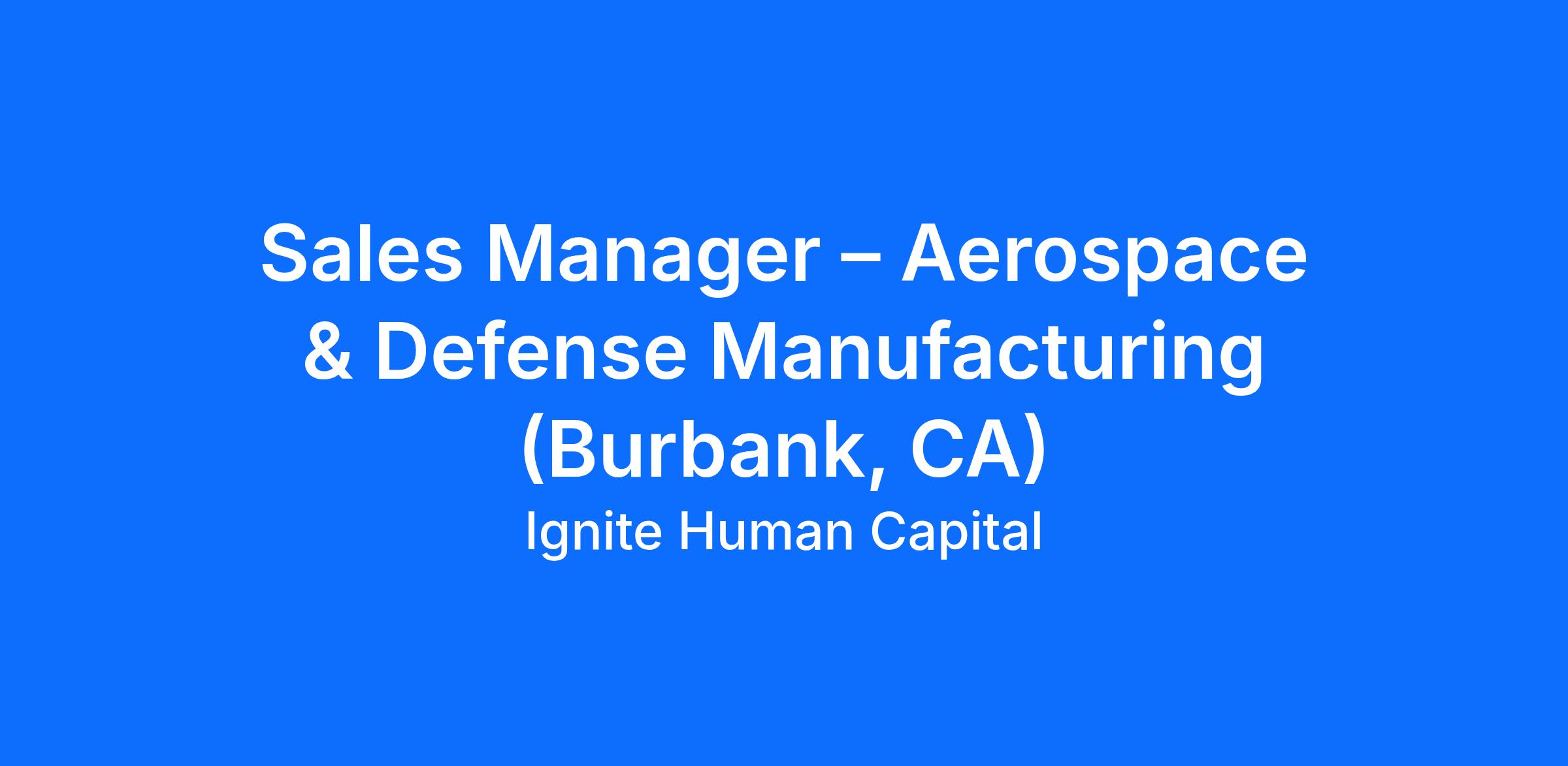 We are hiring a Sales Manager to lead a small team and drive strategic growth within a well-established aerospace manufacturing environment. This is a fully onsite leadership role based in Burbank, CA, supporting aerospace and defense customers.
