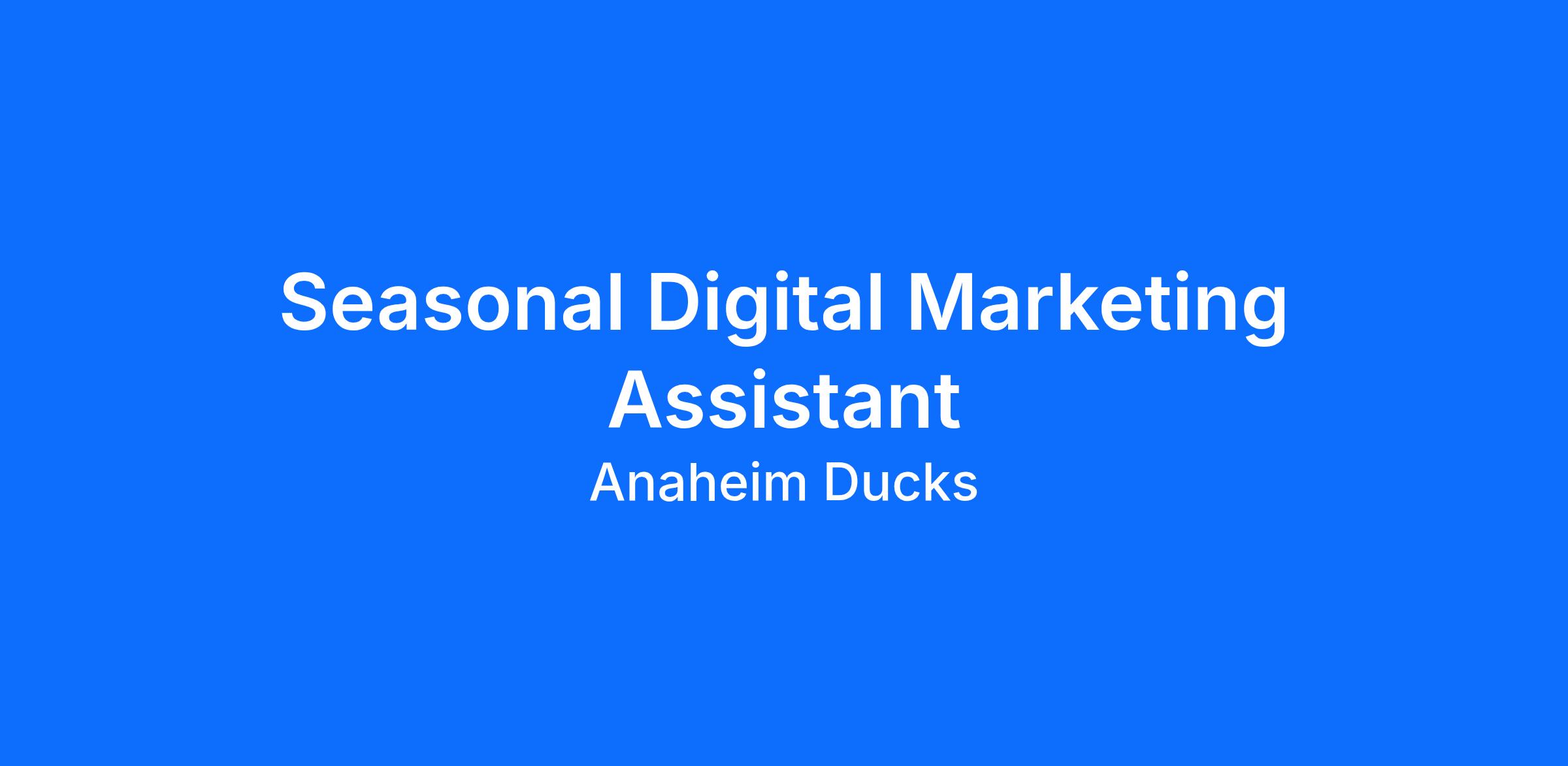 The starting hourly rate for this position is $25.00 per hour.The Digital Marketing Assistant is a full-time, seasonal position within the Marketing Department of the Anaheim Ducks and focuses on assisting the needs of the digital marketing team. This role reports to the Director of Digital Marketing & Analytics and assists with the day-to-day execution and evaluation of various digital marketing campaigns.